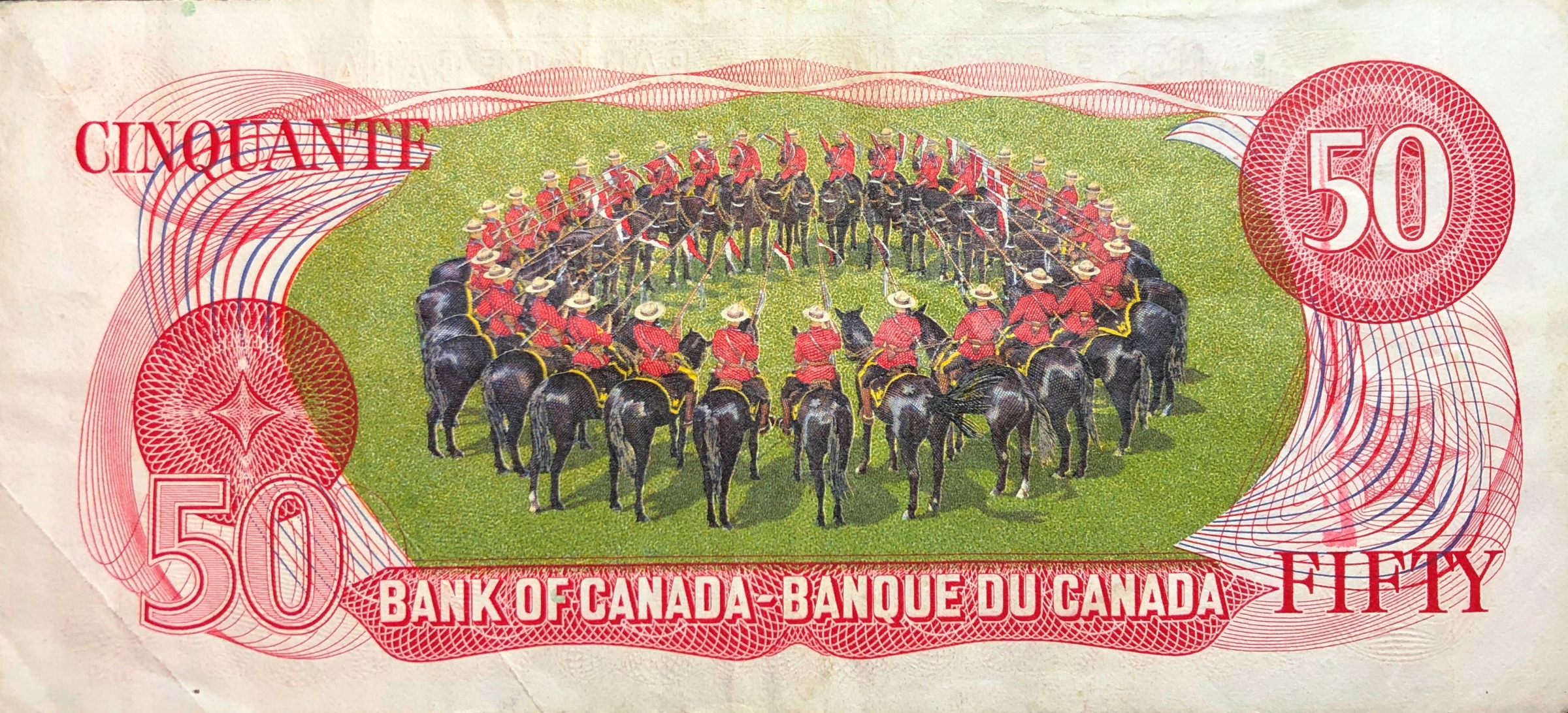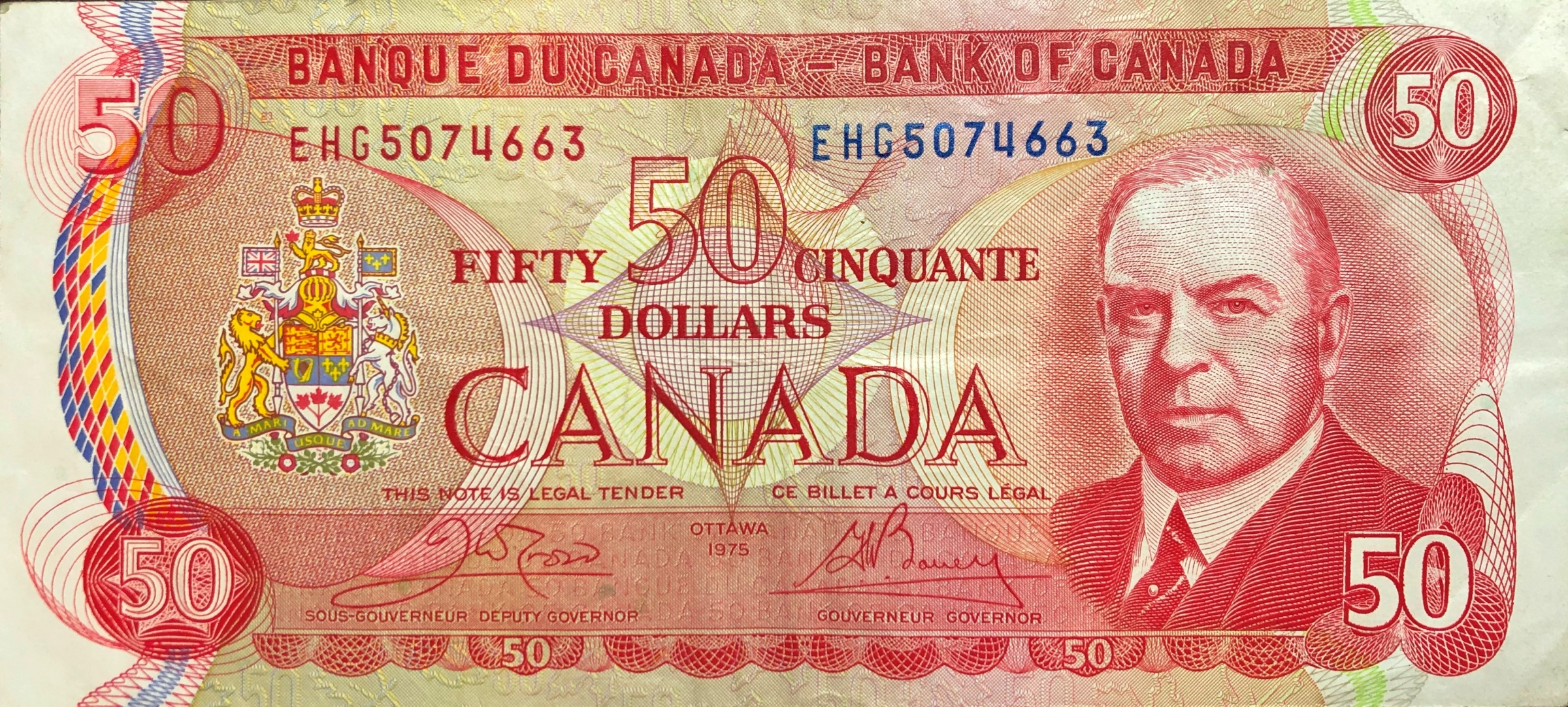 The face of the $50 note features an engraving of William Lyon Mackenzie King by George Gunderson based on a Karsh portrait of Canada’s longest-serving prime minister. The dome formation from the RCMP musical ride appears on the back of the note. This is the only denomination in the series where the vignette on the back was produced by a lithographic rather than an intaglio process. The note was issued in March 1975 and printed by Canadian Bank Note Company Ltd.